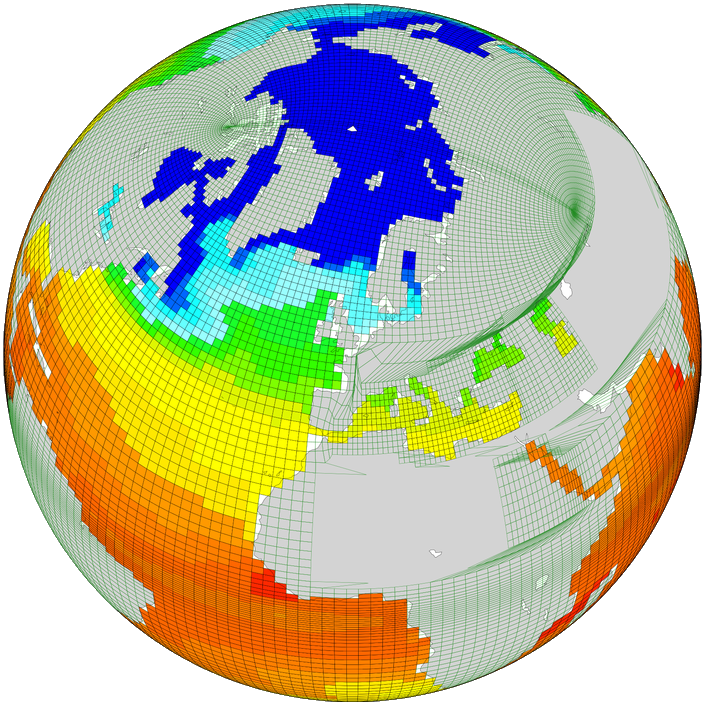 NEMO can use various grids, but is frequently used with ORCA type grids. ORCA grids store global data in 2-dimensional ny * nx arrays. All cells are four-sided. The grids are based on tri-polar layouts, but X and Y spacings are irregular and not given by any defined functional forms.